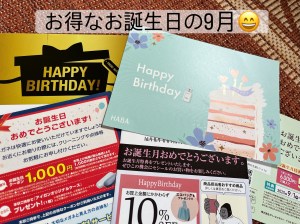 お誕生日の9月はメールでLINEでハガキでおめでとうお得ショッピングのご案内がやってきます🤗お得をありがとう!そうは言っても今必要のないもの買うわけもなく…ああ庶民😅